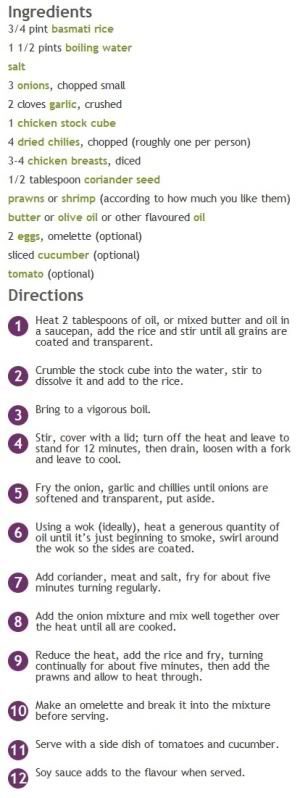 in desperation of finding ways to cook, i pick a local dish to try, the "NASI GORENG" I found the recipe explicitly complicated and hence i gave up. if you're keen to know what the recipe is, here it is...